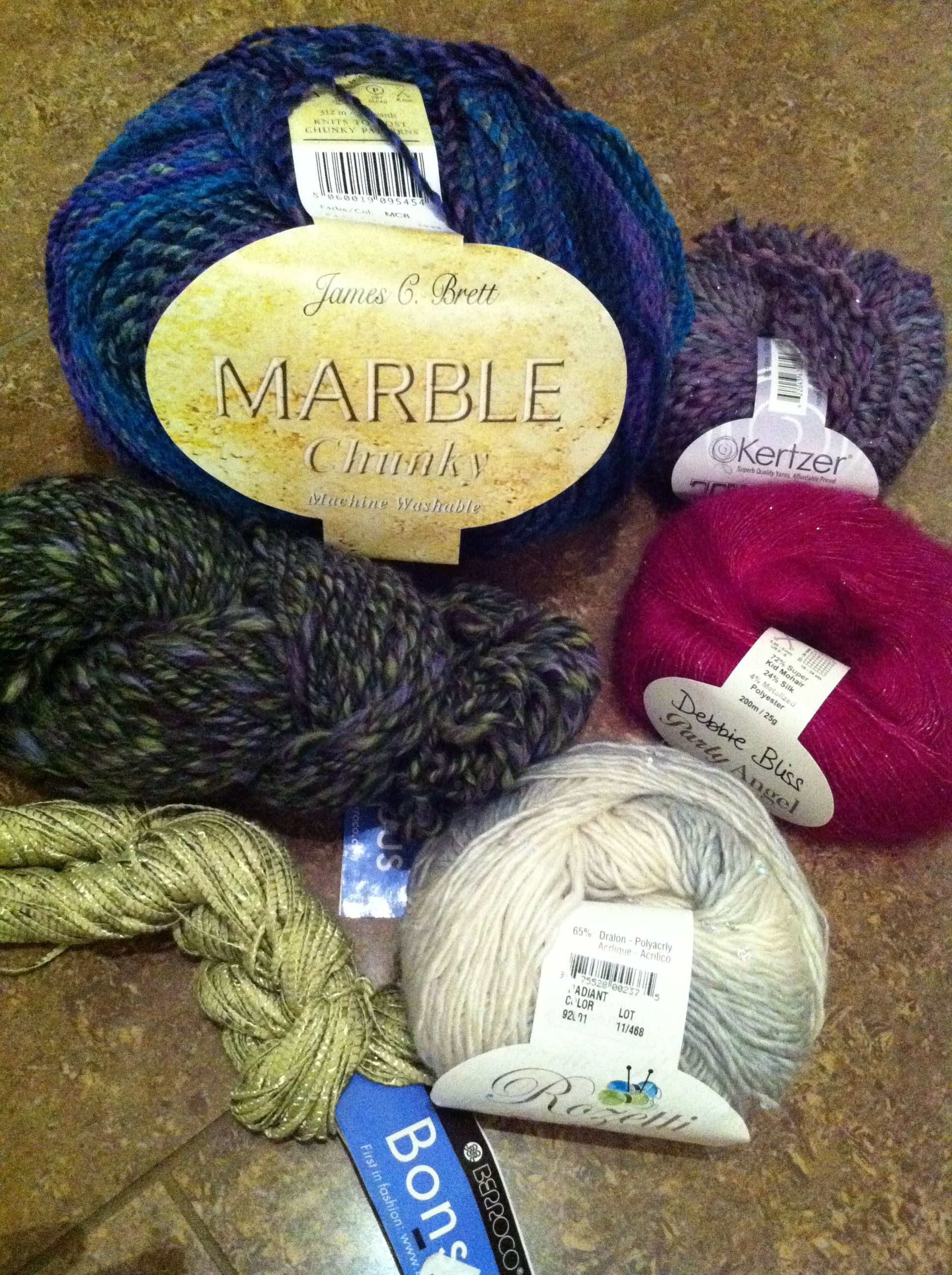 I’d been thinking something with blue in it, something bright, something to make my eyes stand out, since I’ve got a black winter coat. I was looking at first at the chunky yarns, trying to find one yarn in 6 shades that I liked, but Diana who works there counseled me to just pull out anything that made me happy, and pile it on the table, and we’d go through it together.