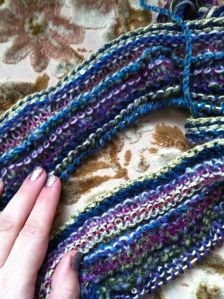 Anyways, I got it back on the 3.5mm, and did about 4 more rows just so it would feel “finished” to me. I confess I didn’t roll or flip, I just used the yarns I wanted to use, and made the scarf look slightly asymmetrical, yet balanced. I got through about 1.5 of those rows yesterday, but it got late and I put it off ’til today.