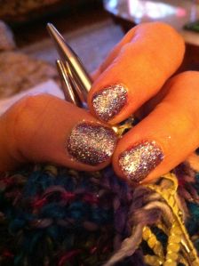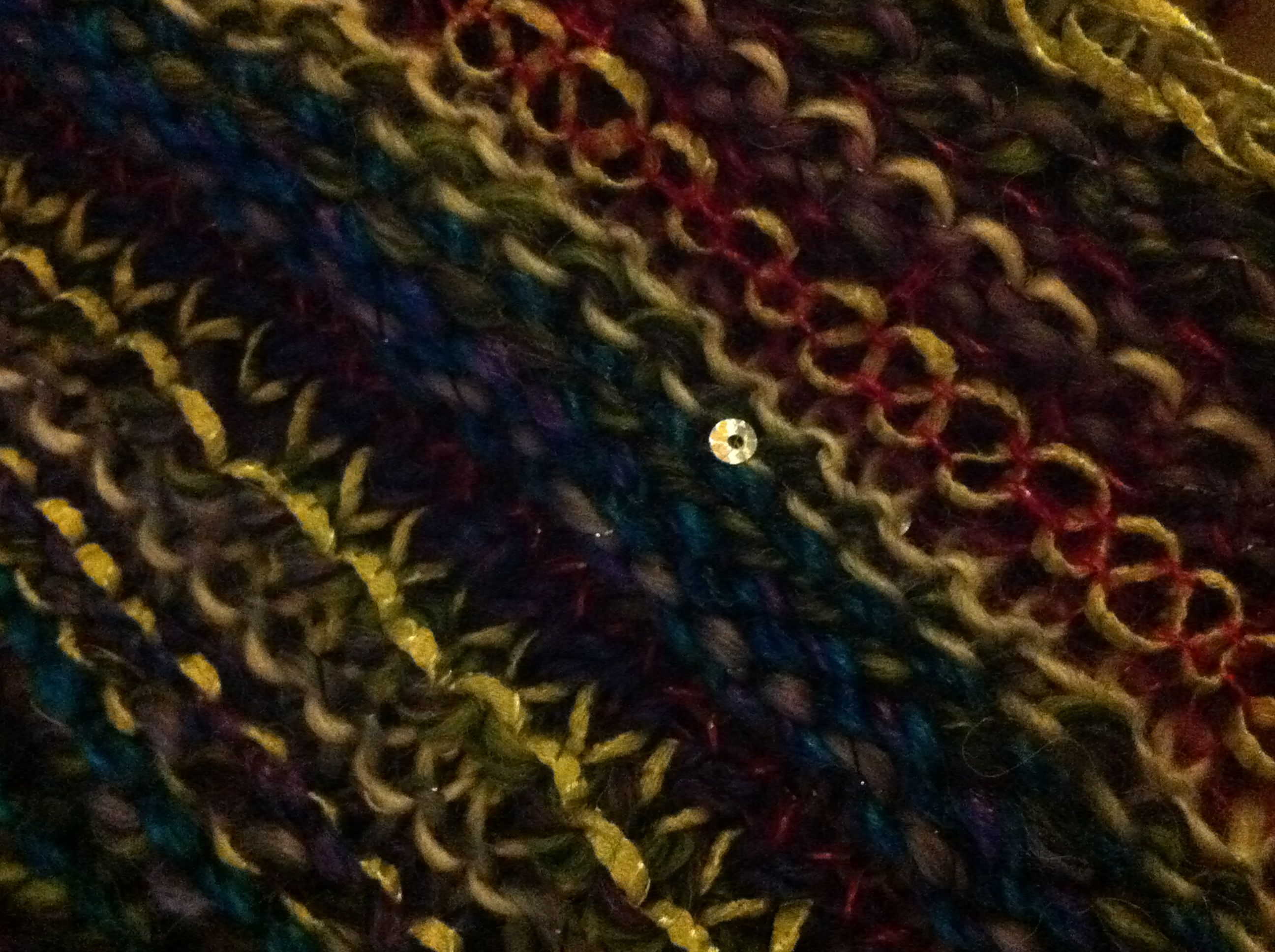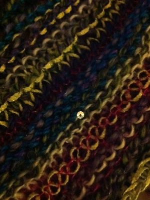-and I couldn’t wait to take pics. Look- it’s a sequin! I love how the thinner mohair yarn around the thicker yarn makes that “scribble” effect. I need a whole shawl like that.
