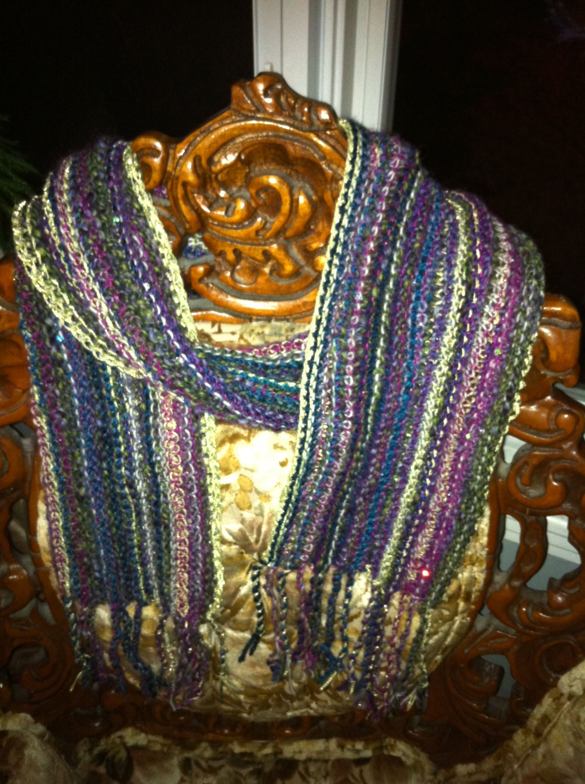 There’s been some questions about how many stitches to cast on. It depends on your personal preference of how long you want your scarf, and also how thick your yarn is. Six feet long in sock-weight will require many more stitches than six feet long in worsted weight.