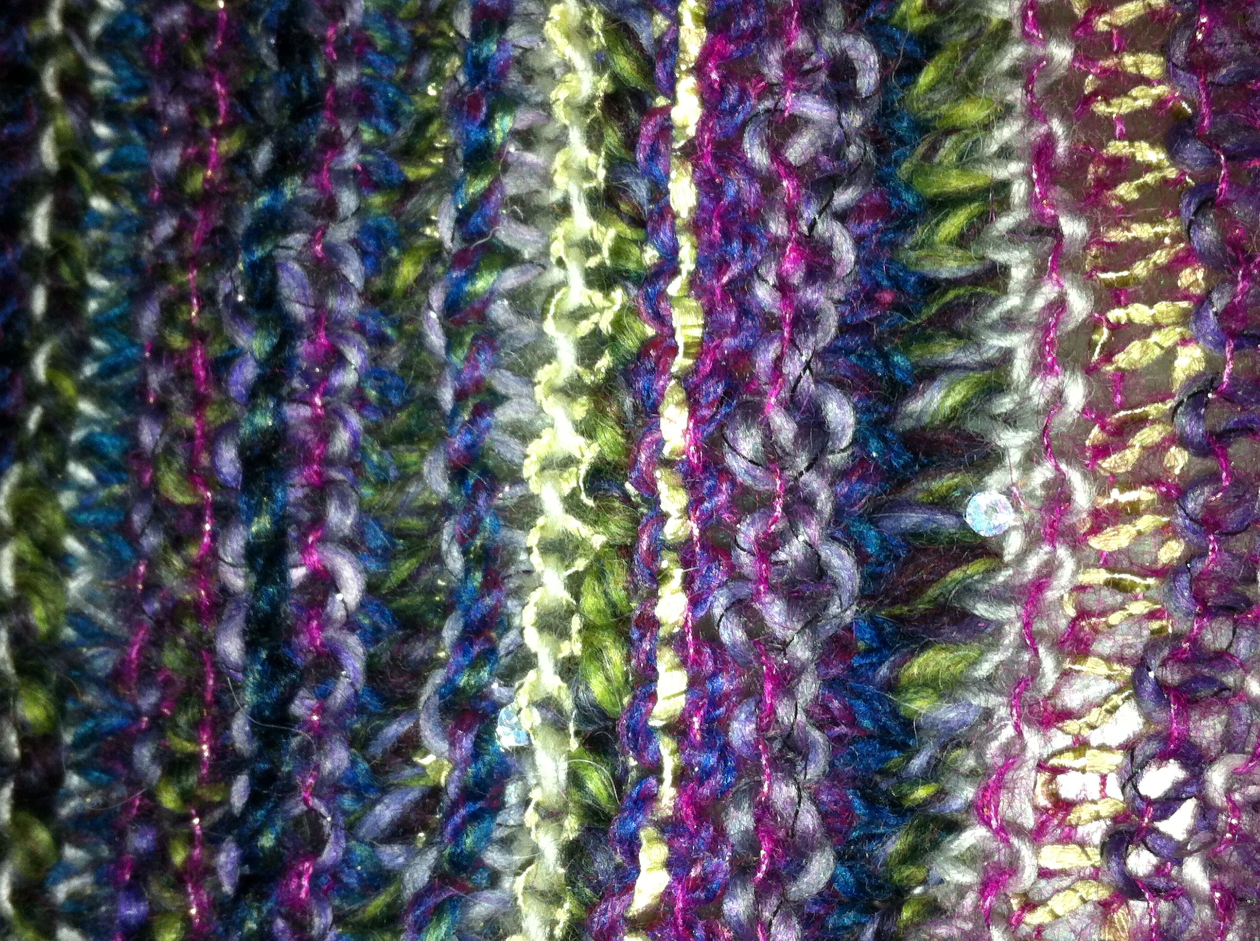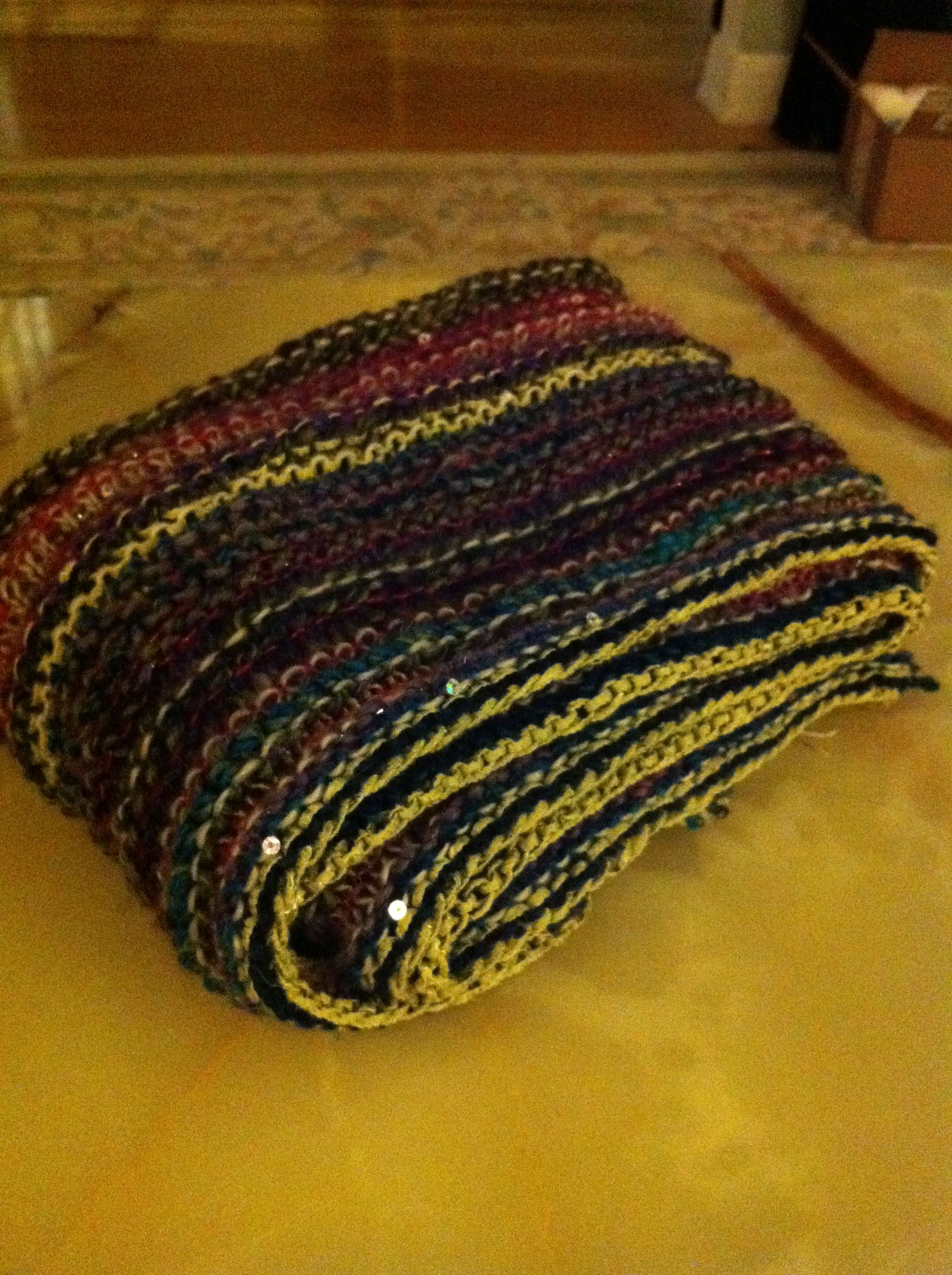 This game evolved from a challenge I was given in my knitting class to knit a “random” scarf- we had to select a bunch of varying yarns in colors we liked and work them in knit and purl rows to form a scarf. It was to be an exercise in the textures you can achieve with those two little stitches.