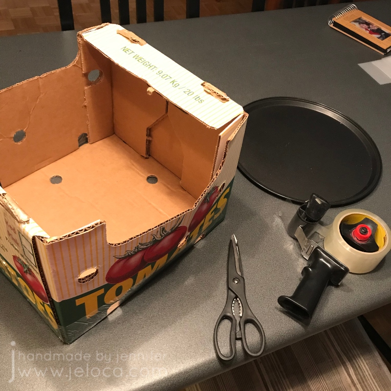 One important step that often gets overlooked is transport. As I’d be driving the cake to the party, before even starting to bake I had to make sure I had a way to bring the cake with me safely. First I selected the platter I wanted to use – in this case a pizza oven tray – and made sure I had a box that fit. This crate saved from a Costco run worked perfectly. I used scissors to cut one of the sides so I could flatten it and slide the cake in, and the packing tape was there to re-tape the box again for the ride.