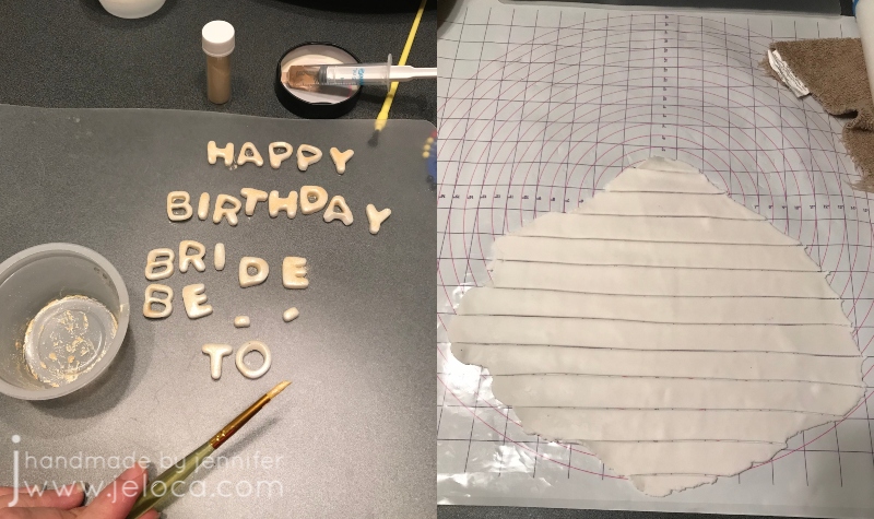 If you are planning to have wording around the base of the cake platter, cut out your fondant letters now so they have a chance to harden. We were having the party right after my sister’s birthday so I cut out the words “HAPPY BIRTHDAY BRIDE-TO-BE” and brushed them with gold “paint” made by mixing pearl dust with vodka. Tip: use a medicine syringe for easy dispensing of small amounts of vodka to avoid over-diluting your dust and needing to add more.