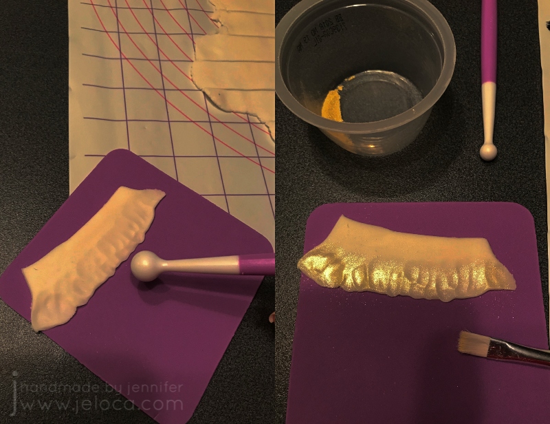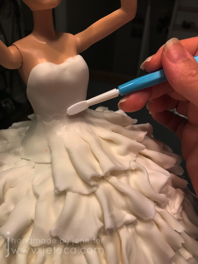 You will need a ball tool and shaping foam mat in order to make the ruffles. Note: I’ve deliberately darkened the contrast & shadows in this image to show you the ruffle texture. Using the ball tool, roll over one edge of your fondant strip to thin and flare it out. Don’t go so thin that it tears through. As I was making my dress have an ombre effect, I used more pearl dust gold “paint” to add sheen to the ruffled edge. Don’t bother painting the flat edge as it won’t be seen.