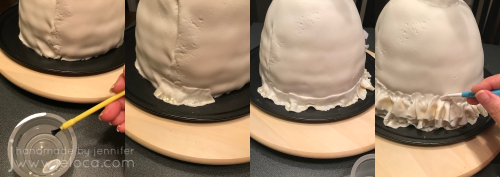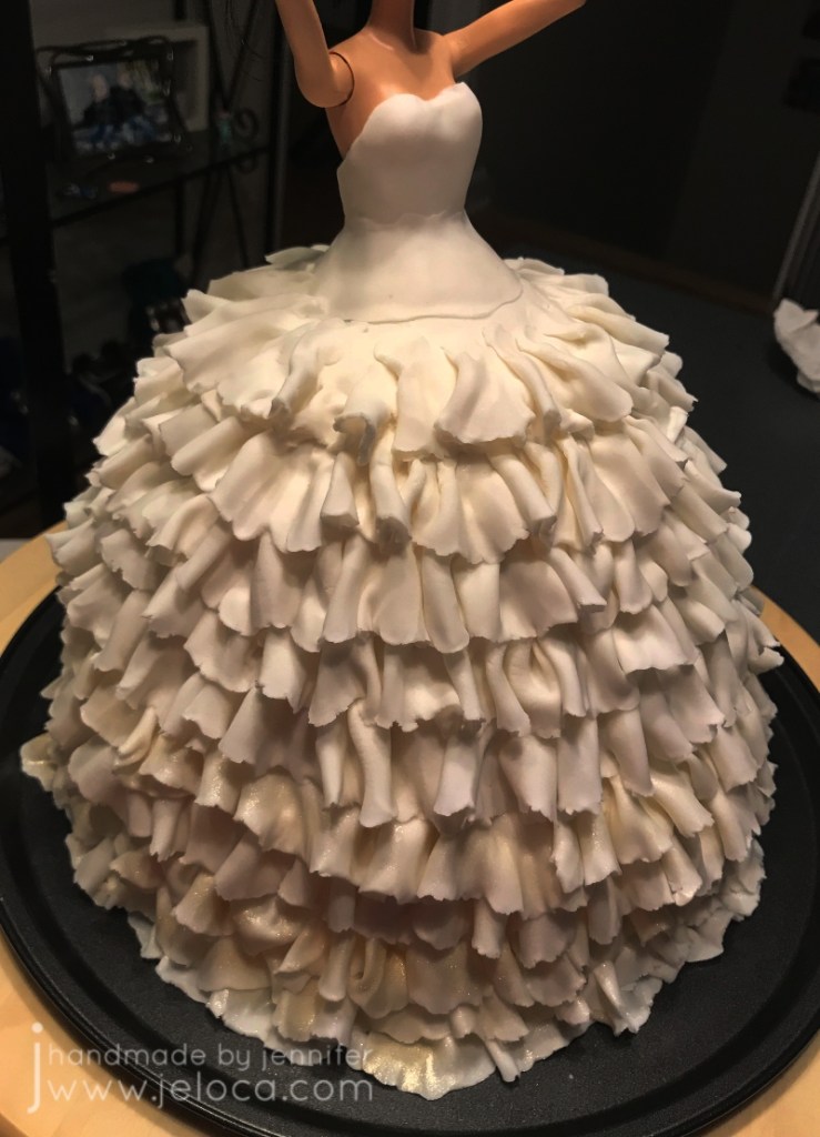 Now you’re ready to work on the dress’ ruffles. Be forewarned – this takes a long time. Cake decorating always does, but looking at timestamps from my images I can see the ruffles portion alone took about 3.5 hours. (It also adds a lot of extra weight to the cake which is partly why I used the pizza tray as my platter – I didn’t want to take a chance on a plastic platter cracking under the weight).