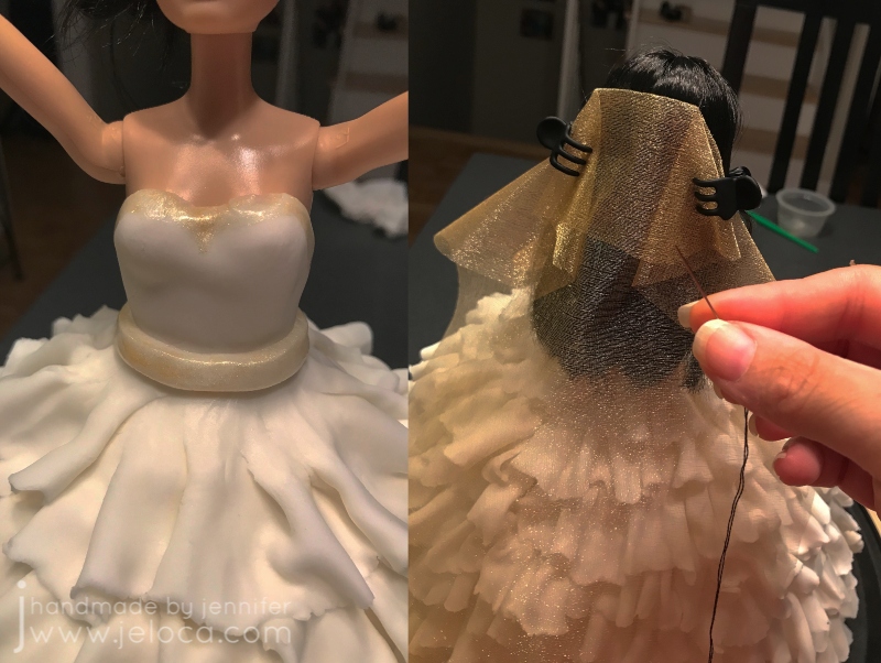I added a gold paint trim and a fondant “belt”, and then sewed some gold tulle fabric into place as a veil using thread that matched the doll’s hair color. I also added the doll’s original gold bracelet.